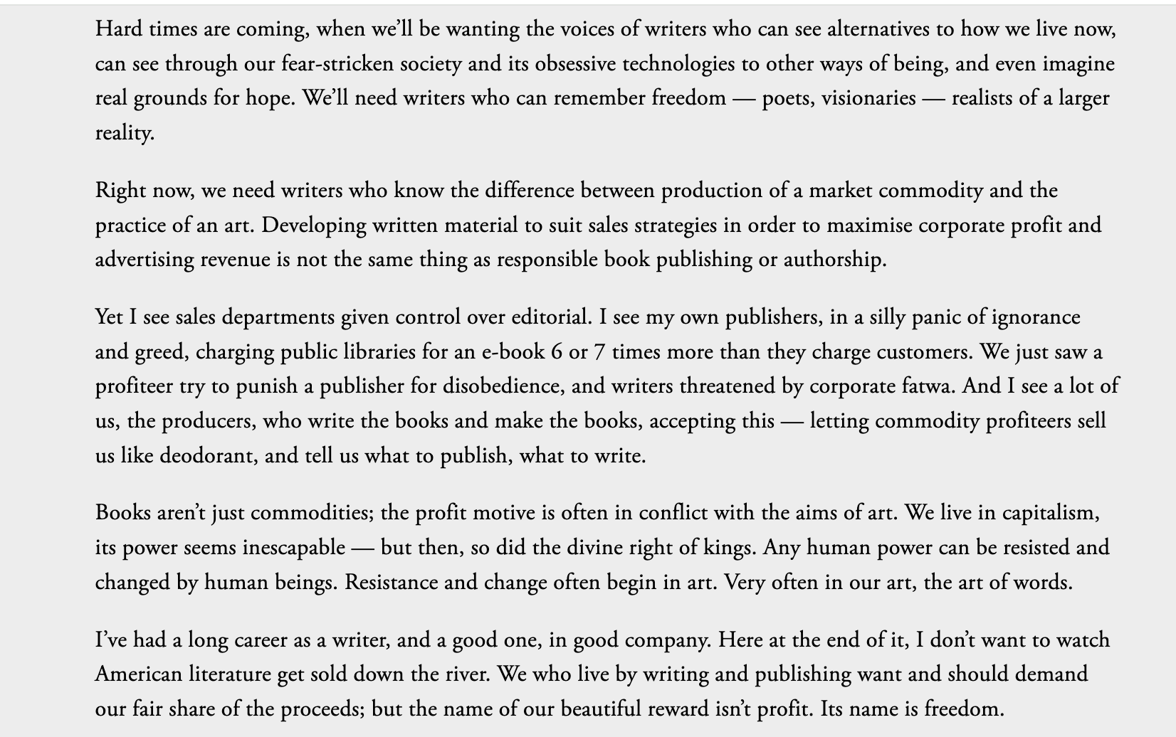 From Ursula K. LeGuin’s speech in acceptance of the National Book Foundation Medal for Distinguished Contribution to American Letters
